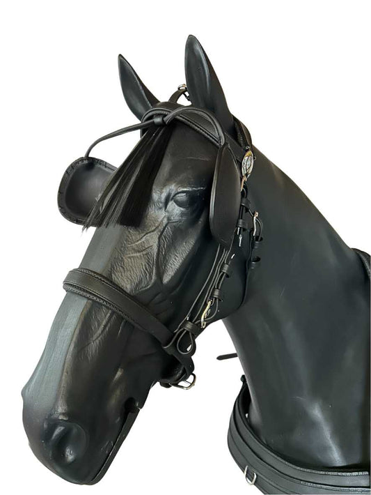 Durchdachte Details wie verstärkte Blendriemen mit Drahteinlage halten die Blendklappen in der korrekten halb-seitlichen Stellung. Die Auswölbung im oberen Drittel schafft Platz für Auge und Wimpern des Pferdes.