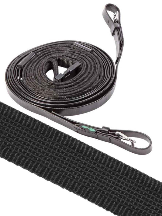 Fahrleinen aus Biothane und Tech Comfort bieten für Einspänner eine pflegeleichte Alternative zu Lederleinen. Die Einspännerleine besteht aus zwei Einzelstücken, die am hinteren Ende zusammengeschnallt werden und eine präzise Verbindung zwischen Fahrerhand und Pferdemaul herstellen. Beide Kunstmaterialien überzeugen durch ihre Griffigkeit und Formstabilität.