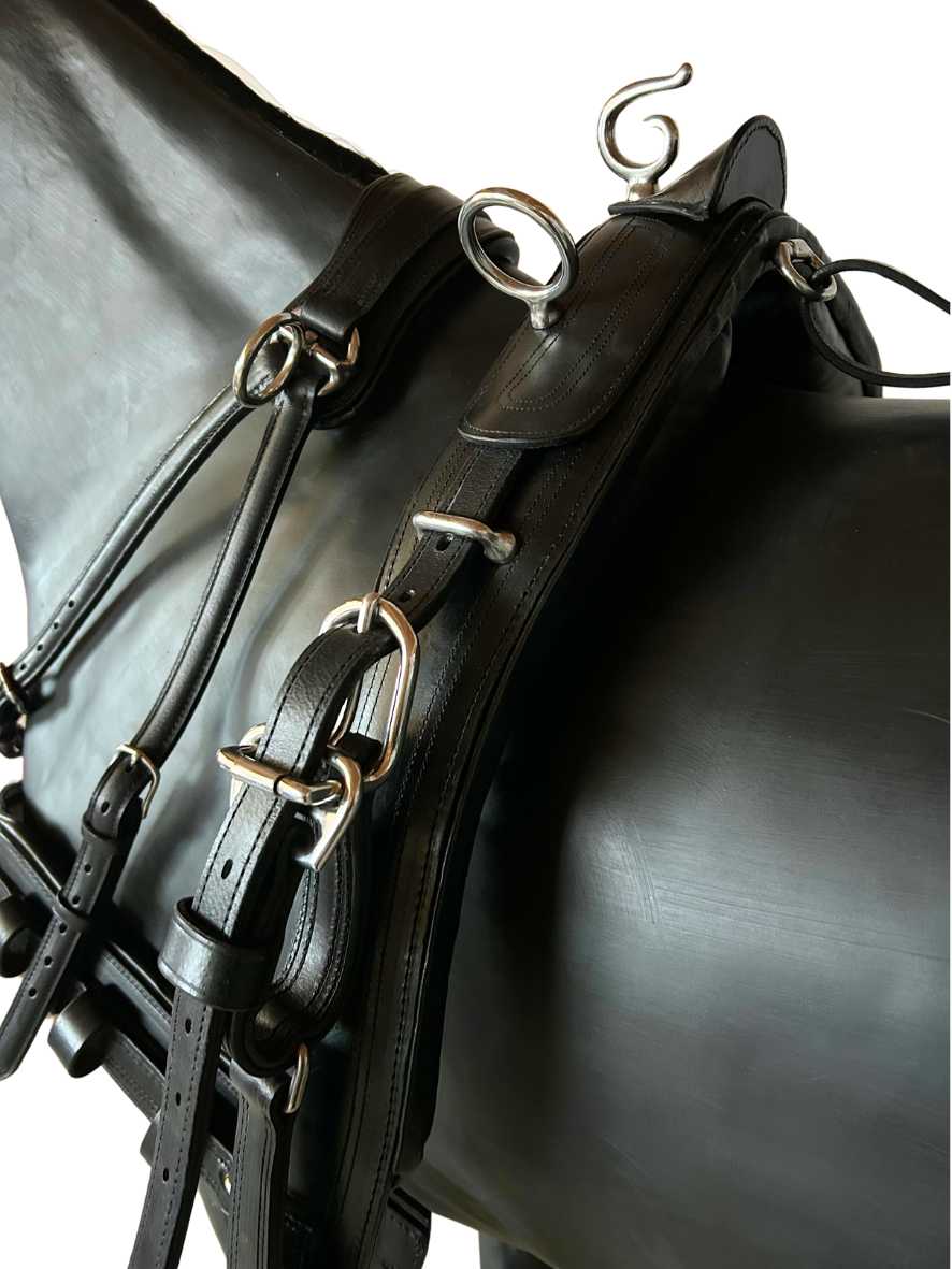 Das Selett wird genauso gegurtet wie der Sattelgurt eines Reitsattels. Bitte beachte, dass der Bauchgurt links und rechts am Selett in ungefähr der gleichen Lochzahl gegurtet ist. Dadurch wird eine mittige Position des Bauchgurtes auf dem Brustbein des Pferdes erreicht.